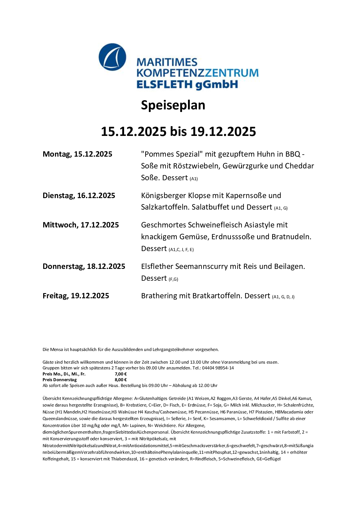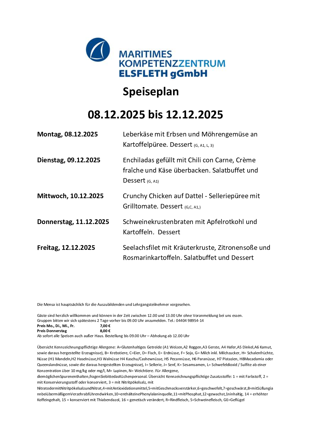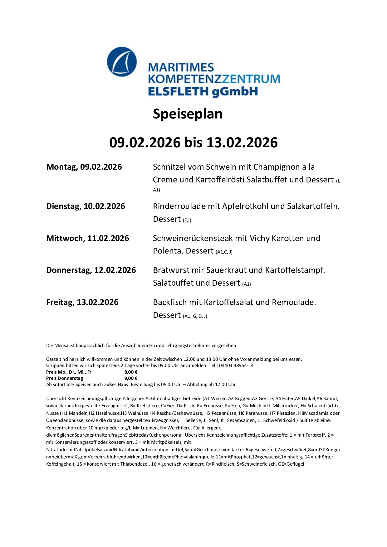 Die Mensa ist hauptsächlich für die Schiffsmechanikerazubis und Lehrgangsteilnehmer vorgesehen, Einzelne Gäste können auch mittags essen, müssen sich aber spätestens am gleichen Tag bis 09:00 Uhr anmelden.