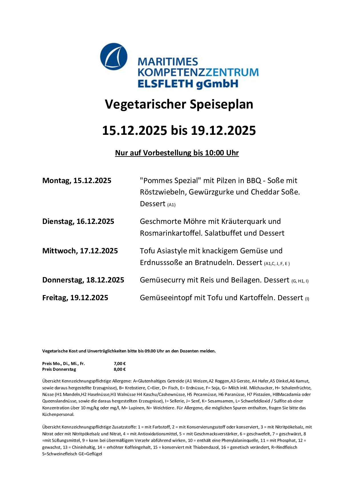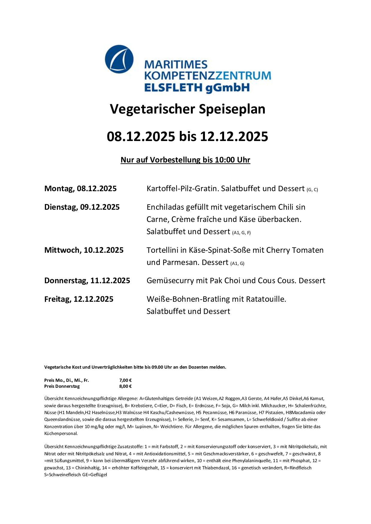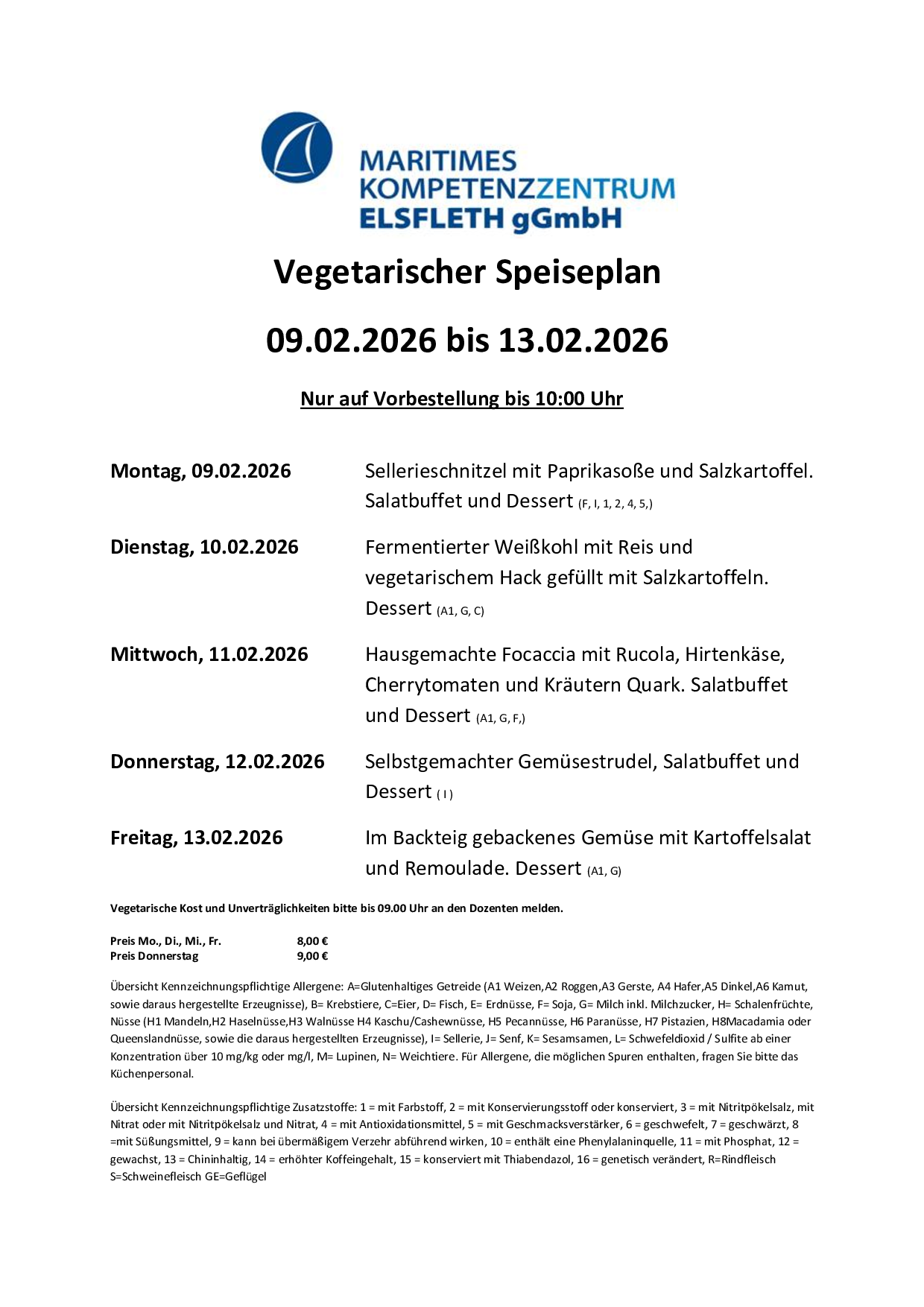 Die Mensa ist hauptsächlich für die Schiffsmechanikerazubis und Lehrgangsteilnehmer vorgesehen, Einzelne Gäste können auch mittags essen, müssen sich aber spätestens am gleichen Tag bis 09:00 Uhr anmelden.