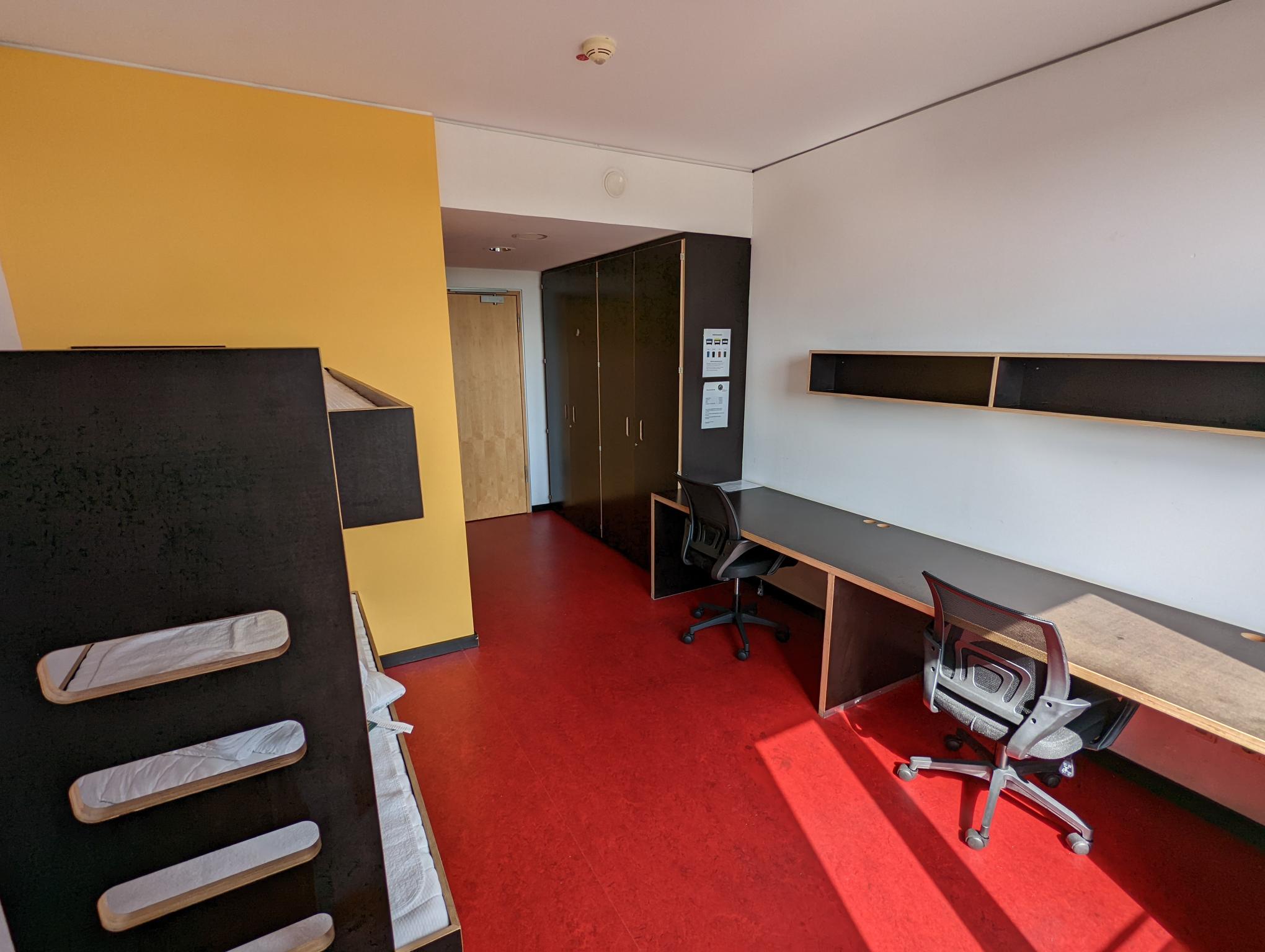 Jedes Zimmer verfügt über Etagenbetten, Nasszelle mit Dusche, WC und Waschbecken, Kleiderschrank, Schreibtisch für zwei Personen und zwei kabelgebundene Internetzugänge.